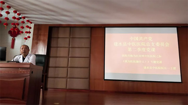 2020年6月22日,建水县中医医院第二季度党员大会顺利召开,会议由党总支书记赵景文主持,王健院长为全体党员讲党课。