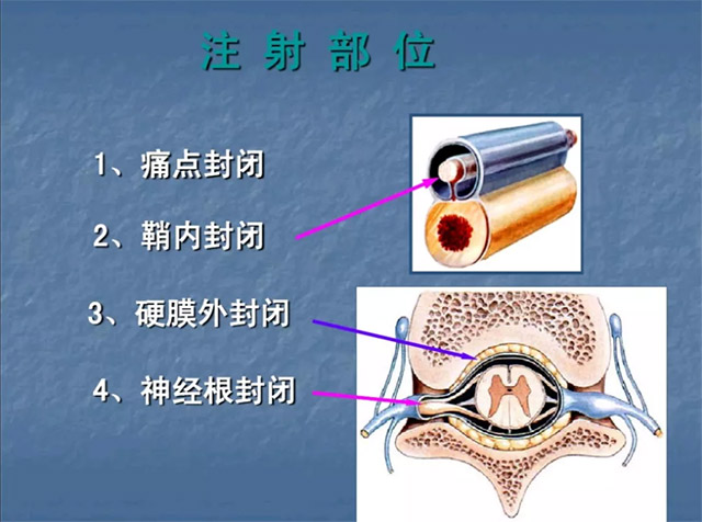 封闭治疗也叫“局封”,是由局部麻醉演变而来的一种治疗疼痛的方法。封闭治疗的基本操作方法是将局麻药和激素类药物的混合液注射于疼痛的部位,达到消炎、镇痛的目的。封闭治疗是一种简单、安全、疗效可靠的缓解患者疼痛或不适的治疗方法。