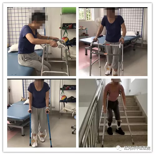 治疗后期基本情况:坐位平衡3级,站立平衡2级。Berg评分:39分,可独立完成坐位-站立位及站立-坐位转移,腋拐辅助上下楼梯,监护下室外独立步行较远距离,基本生活能自理,现出院后在家可独立照顾自己的饮食起居。