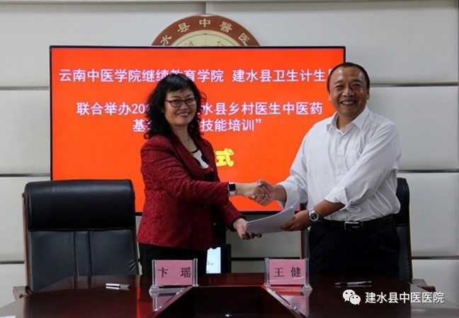 2017年9月21日17:00,云南中医学院继续教育学院院长卞瑶教授与建水县中医医院院长王健在综合楼二楼会议室签署了合作协议。签约仪式上,王健院长对云南中医学院继续教育学院长期给予我院的关心和支持表示衷心感谢,卞瑶教授也希望通过双方不断地交往和合作,促进建水县中医药事业的长足发展,更好地服务于基层百姓。此次签约仪式的顺利举行,标志着2017年建水县乡村医生中医药基础知识与技能培训项目正式启动。