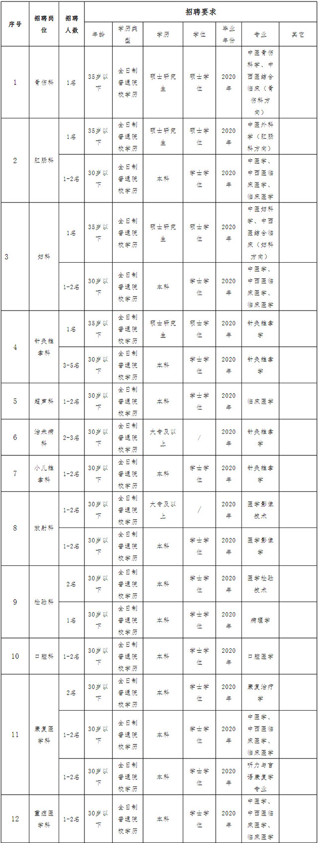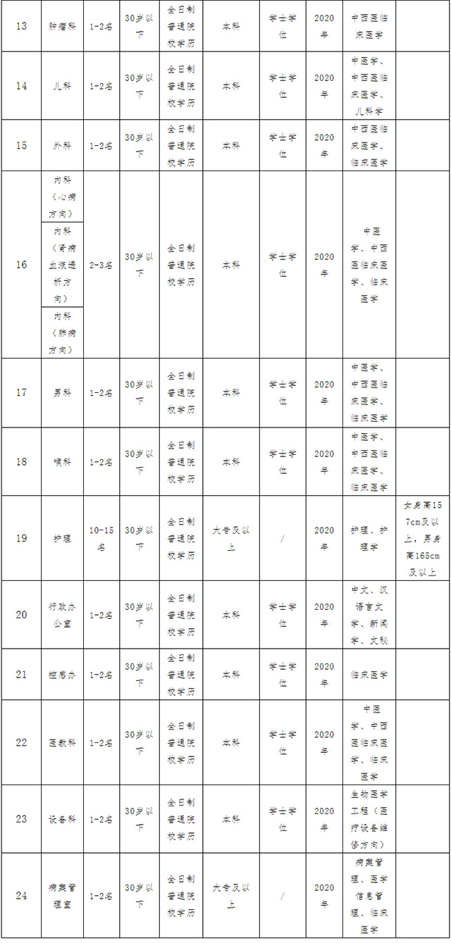 为进一步提高医院综合服务质量,结合医院工作需求和发展情况,建水县中医医院本着“公开、平等、竞争、择优”的原则,面向2020年全日制普通高等院校应届毕业生(具有相应学位)和高等院校医学类本科及以上学历毕业后直接参加国家计划内住院医师规范化培训合格且具有国家执业医师资格的人员,招聘编制外(合同聘用制)员工,现将相关招聘事宜公告如下: