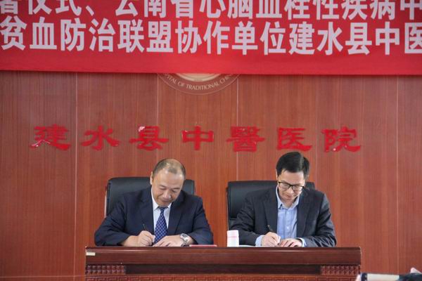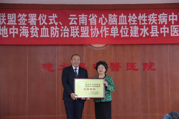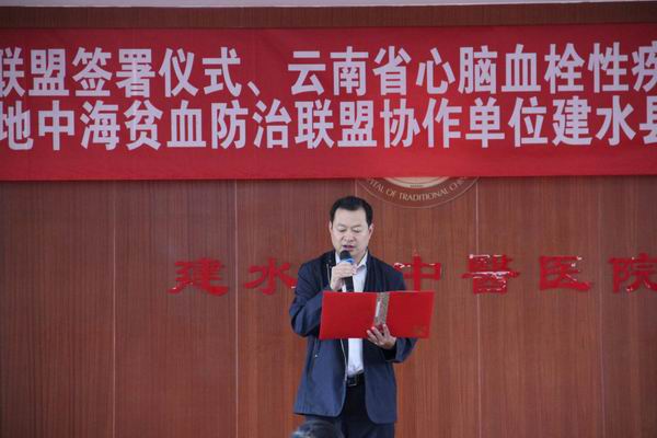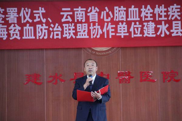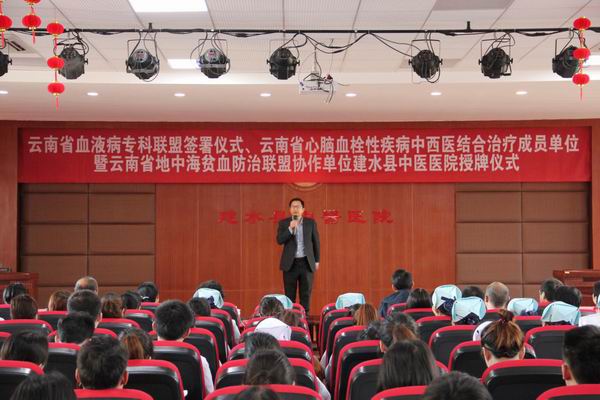 建水县卫生健康局局长邓皓文首先致欢迎辞,欢迎昆华医联体血液专科联盟、地中海贫血联盟、心脑血栓中西医结合联盟落户建水县,为建水县中医药事业在血液疾病诊治工作提供技术帮扶,这是深化全县医疗卫生体制改革,推动全县中医药事业发展的重要举措。同时,对我院正式加入“昆华医联体专科联盟”表示祝贺,希望我院以此为契机,统筹规划,开拓进取,突出中医特色,弘扬中医药文化,提升办院水平,努力建设成州内领先、省内一流、全国知名的中医医院。