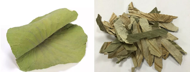 本品为睡莲科植物莲的干燥叶。夏、秋二季采收,晒至七八成干时,除去叶柄,折成半圆形或折扇形,切丝,干燥备用。