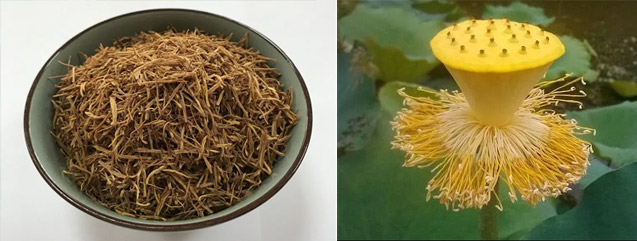本品为睡莲科植物莲的干燥雄蕊。夏季花开时选晴天采收,盖纸晒干或阴干。