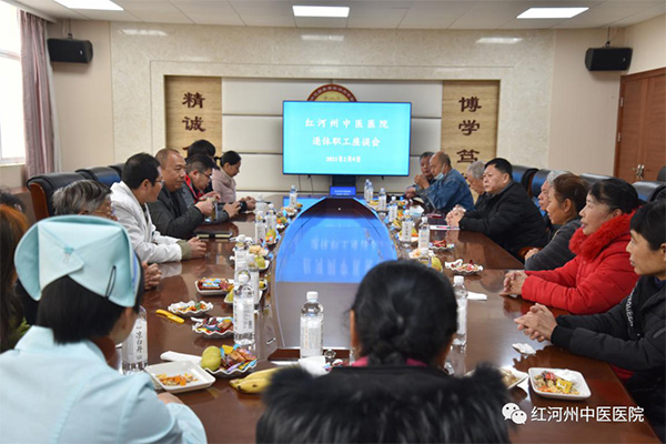 2月9日上午,红河州中医医院2021年退休职工新春座谈会在综合楼二楼会议室召开。我院党委书记王健等领导班子成员出席座谈会。会上,院领导班子成员与老同志们欢聚一堂、共贺新春,亲切交流。会议由党委副书记、纪委书记赵景文主持。