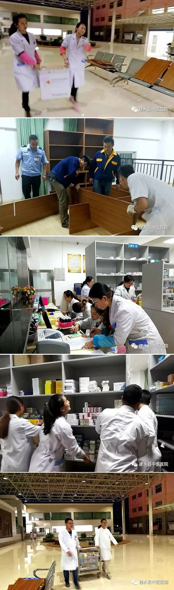 为了医院发展,科室规范,2017年3月15日在院领导及科主任的带领下,我院住院西药房与门诊西药房进行了整合。参与搬迁的科室有药剂科、保卫科、总务科的同事们,虽然搬迁工作繁重,但大家在不影响正常工作的情况下把搬迁工作进行得井然有序,搬迁工作从当天下午直至深夜圆满结束。体现了大家团结协作、不怕苦、不怕累的精神。(药剂科 建水县中医医院)