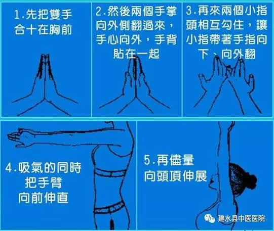 3、手少阴式:然后把双手合十在胸前,两个手掌向外侧翻过来,手心向外,手背贴在一起。再来两个小指头相互勾住,让小指带着手指向下、向外翻。吸气的同时把手臂向前伸直,再尽量向头顶伸展。接下来呼气,双手慢慢地按原来的路线收回来,刚才怎么伸上去的,现在就怎么放下来。双手再回到合十的状态。共做13组,放松收功。