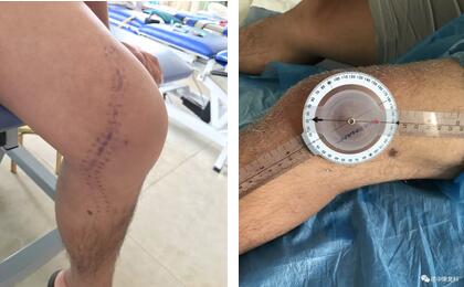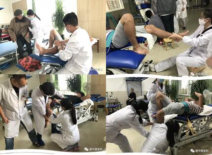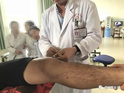 02、2017年2月21日,收治一名车祸所致右侧半月板撕裂伴副韧带断裂术后膝关节活动受限患者,入院时膝关节疼痛,屈伸活动明显受限,姿势步态异常。予运动疗法中的肌肉软组织牵伸技术、关节松动术、肌力训练、物理因子治疗后,膝关节运动功能恢复,行走自如。