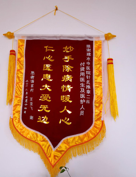 据了解,该患者因"腰部疼痛"入院,症见:腰痛、伴右肘关节疼痛。在我科医护人员的共同治疗下,该患者腰部疼痛减轻,配合小针刀治疗后,腰部及右肘关节疼痛明显好转。住院期间,医护人员对患者悉心照顾,让她感受到了亲人般的关怀,出院后为表达对我科医护人员的感谢,特送来锦旗以表谢意。