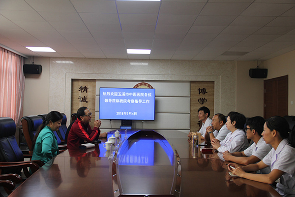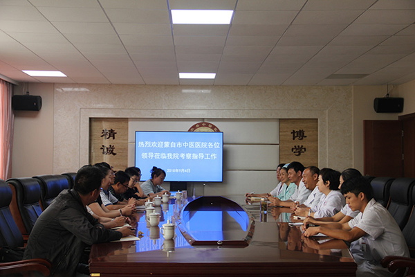 2018年9月4日,玉溪市中医医院副院长杨晓歌、党办主任陈虹等一行4人,蒙自市中医医院院长张光锋、副院长胡纤龄带领办公室、医务科、护理部、内科、外科、皮肤科、针推科、妇产科、药剂科科室负责人一行14人到我院考察交流。建水县中医医院院长王健等领导班子陪同参观交流。