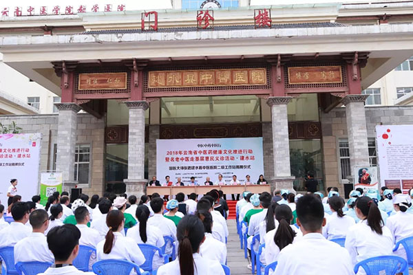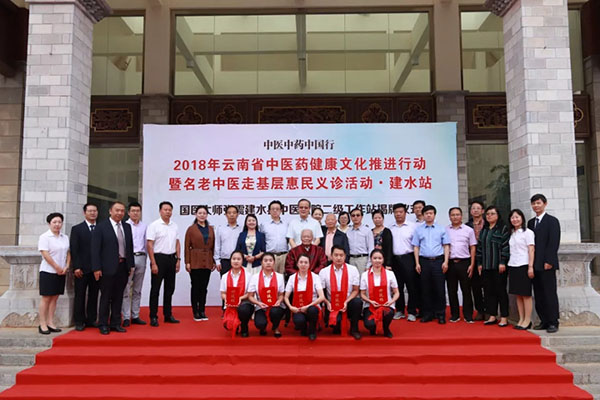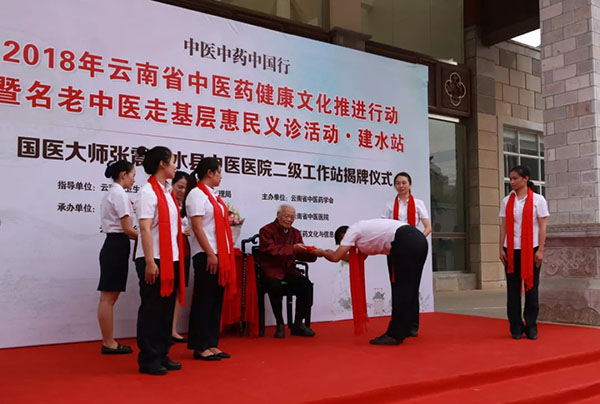 2018年9月15日, 我院在院前广场,举行2018年云南省中医药健康文化推进行动暨名老中医走基层惠民义诊活动开幕式,国医大师张震二级工作站揭牌拜师仪式。本次活动有幸邀请到了国医大师张震研究员、云南省中医药学会郑进会长、云南省国医名师夏惠明教授、云南省名中医李斯文教授、红河州卫生计生局张鹏程主任、中共建水县委宣传部部长杨为文、建水县政协副主席蒋红芳、建水县卫计局副局长常王忠等领导、嘉宾,活动由云南省中医药学会副会长兼秘书长葛元靖教授主持。