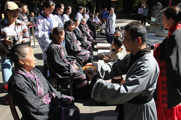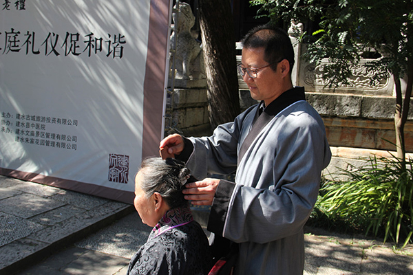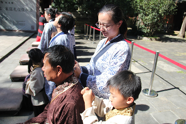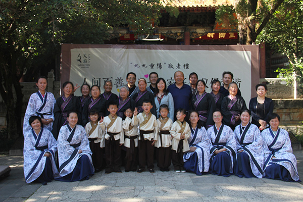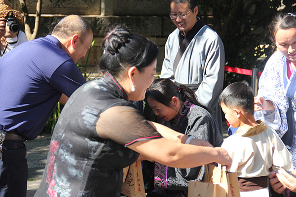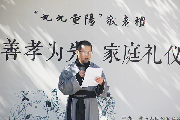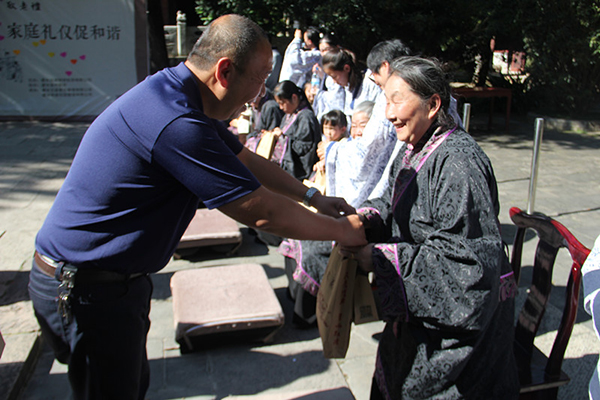 随后,在文庙先师殿前举行了“敬老礼”仪式,主持人为老人、孩子们讲述了九九重阳节的历史渊源、各地习俗及古代孝敬长辈的故事,大家听得聚精会神。还举行了重孝道、感亲恩;尊长辈、事其亲;虔诚心、感天地;观孝行、承孝德 和儿孙辈致爷爷、奶奶或外公外婆的一封信仪式。儿孙们向在座的长辈们表达了深深的重阳节祝福,为长辈们行敬老礼,祝愿老人们健康长寿,阖家团圆;来自县旅公司和县中医院的职工们走上舞台,表达了自己对活动主办方的由衷感谢以及对老人们、孩子们的最诚挚的祝愿。台下不少老人们听着祈愿话语,禁不住热泪盈眶。