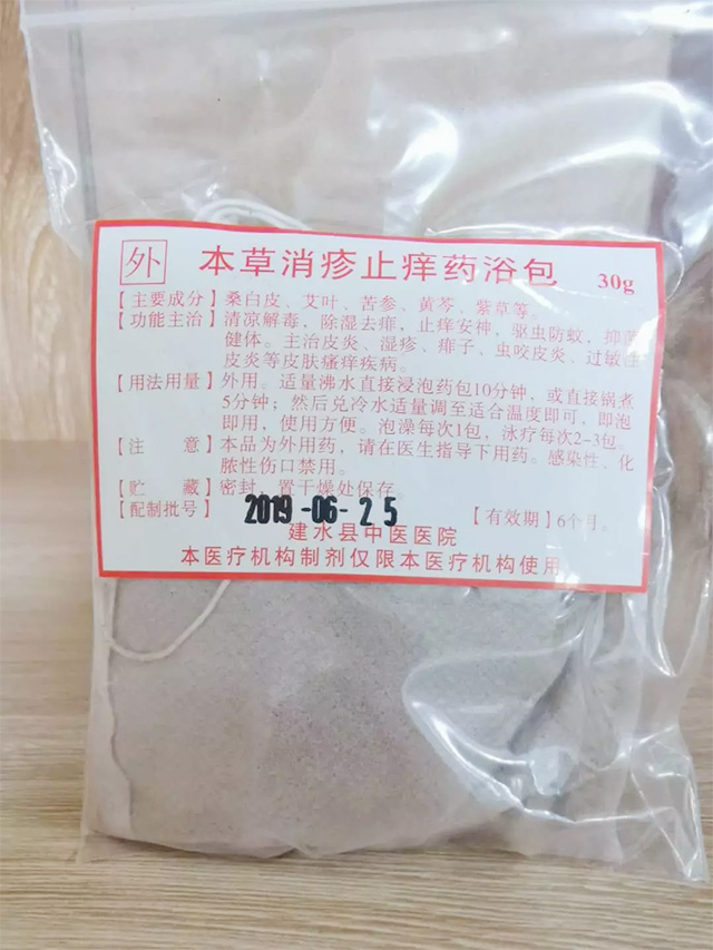 我院皮肤科特推出本草消疹止痒药浴包,采用桑白皮、艾叶、苦参、黄芩、紫草等中药制成。具有清凉解毒,除湿祛痱,止痒安神,驱虫防蚊,抑菌健体。使用时直接加沸水浸泡10分钟,或直接锅煮5分钟,然后兑冷水调制合适温度即可。可泡澡,可泳疗,使用方便,疗效温和,宝宝也可以使用。对皮炎、湿疹、痱子、虫咬皮炎、过敏性皮炎等皮肤瘙痒疾病疗效很好。