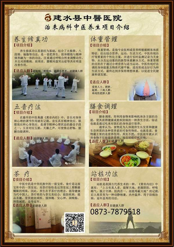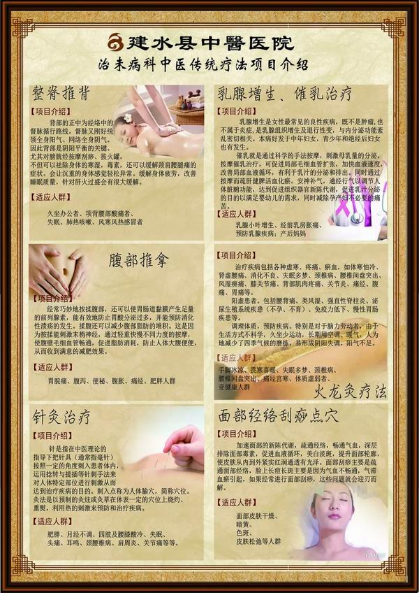 除养生修真功以外,大家还可以配合中医传统疗法进行治疗,建水县中医医院治未病科开展中医传统疗法,手法正骨、整脊推背、乳腺增生推拿、催乳疗法、腹部推拿、火龙灸疗法、面部护理、针灸、拔罐、艾灸、颈椎推拿、腰椎推拿、穴位贴敷、中药药浴、足底推拿、体质辨识、蜡疗、放血等。
