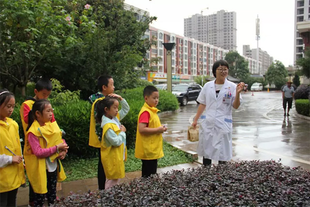 雨停了,制剂室张菊老师带领孩子们参观我院百草园,让孩子们第一次看到“中药”到底是什么植物变成的;孩子们好奇的在百草园里摸摸这里、摸摸那里。