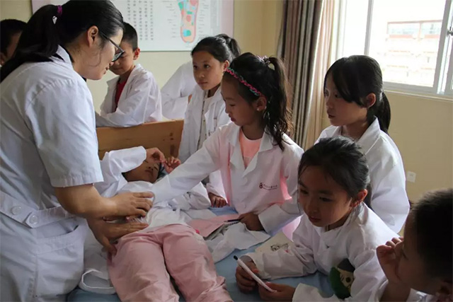 接下来的课程都是让孩子们自己动手的,小儿推拿科董成莲老师邀请同学做小模特,为大家讲解小儿推拿的方法,孩子们边学边做,有胆子大的孩子学会了,还给老师推拿。