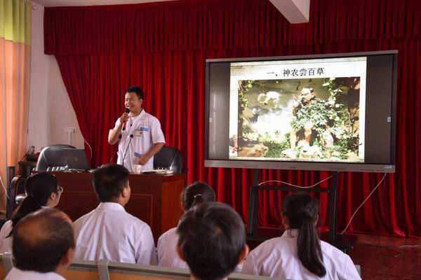 随后,我院药剂科中药师杨艳刚为学生们讲述了以中医药故事“神农尝百草”为主题的中医药文化课程,向同学们介绍了中药始祖神农氏的神话故事和中医药文化的历史起源。将中药的三种分类以及道地药材的概念和意义通俗易懂地向同学们进行诠释。同学们思维活跃,踊跃参与发言与互动。
