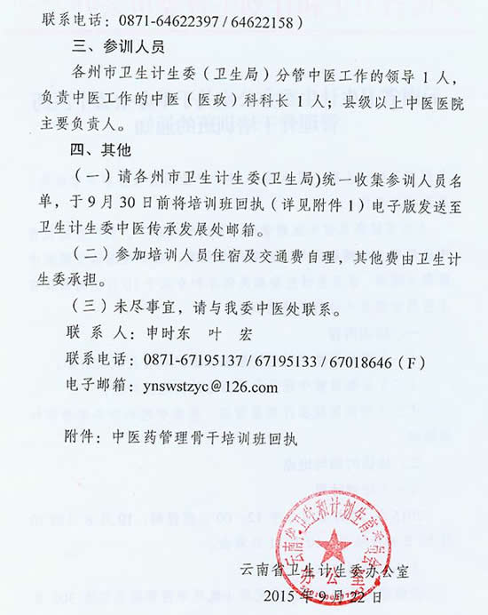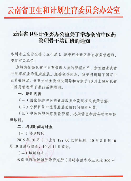 云南省卫生计生委办公室关于举办全省中医药管理骨干培训班的通知