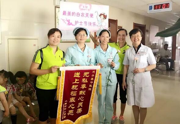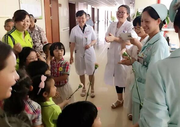 在我院工作人员的引导和幼儿园园长、老师们的带领下,小朋友们依次有序地来到住院楼,我们的“白衣天使”送上鲜花,并由园长和老师代表送上了“无私奉献心灵美、送上祝福表心愿”的锦旗,表达了节日最纯真的问候。
