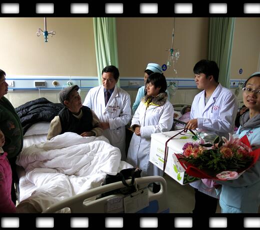 图为在科主任、护士长、主管医生的带领下,全科人员来到了陈爷爷的病床前