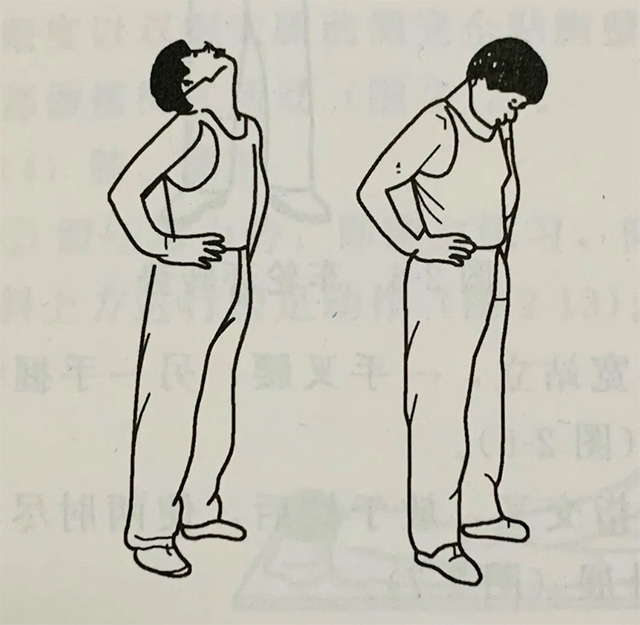 颈部屈伸,在练习前先进行深呼吸,在呼气时头后伸看天,使前额尽量保持最高位置,然后吸气,使颈部还原,再头前屈看地,尽量贴紧前胸,然后还原。
