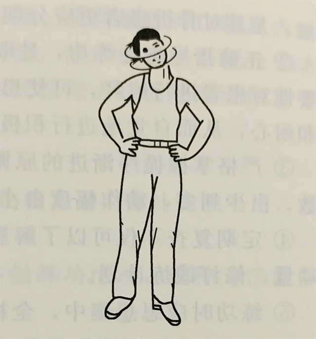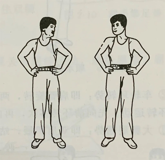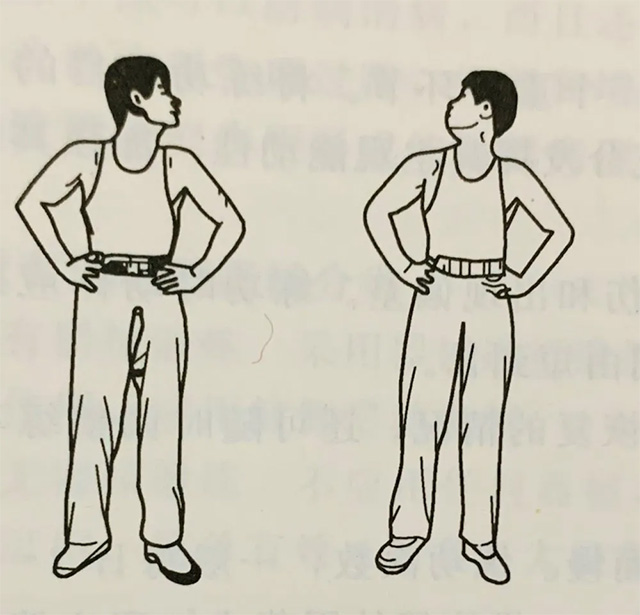这里我向大家介绍一下颈部常用的几个练功方式,锻炼时可采取站立位或正坐位,站立时两足分开与肩等宽,双手叉腰;正坐位时双手叉腰即可。