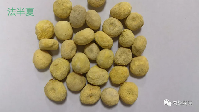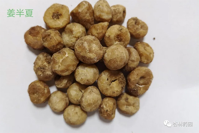 【来源】本品为天南星科植物半夏Pinellia ternata(Thunb.)Breit.的干燥块茎。夏、秋二季采挖,洗净,除去外皮和须根,晒干。捣碎生用,或用生石灰、甘草制成法半夏,用生姜、白矾制成姜半夏,用白矾制成清半夏。