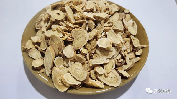 【鉴别要点】本品为圆形或椭圆形的厚片。切面皮部黄白色,木部淡黄色。味微甜,嚼之微有豆腥味。