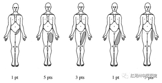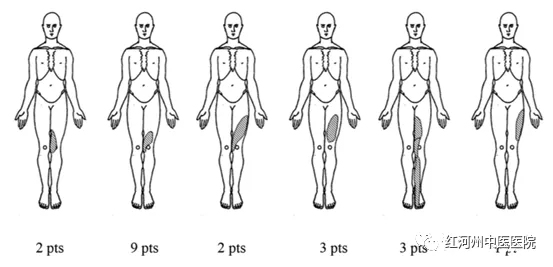 局限在大腿前外侧区域的感觉异常提示L2神经根的敏感性100%,特异性83.7%;膝关节内侧感觉异常提示L3神经根的敏感性80%,特异性97.4%。