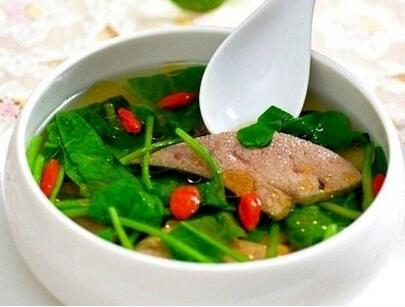 【食谱材料】1、猪肝60克或土鸡肝2付、菠菜130克、食盐、香油各少许,清高汤1公升;2、故纸、谷精、甘杞、川芎各15克。
