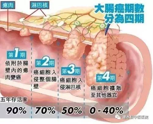 随着医学技术的进步,早期肠癌病例预后良好。美国癌情监测显示,早期的原位癌和I期肠癌,5年生存率分别为94.1%和84.6%;中期肠癌生存率为64%;而晚期则下降到5.7%。