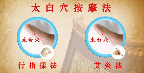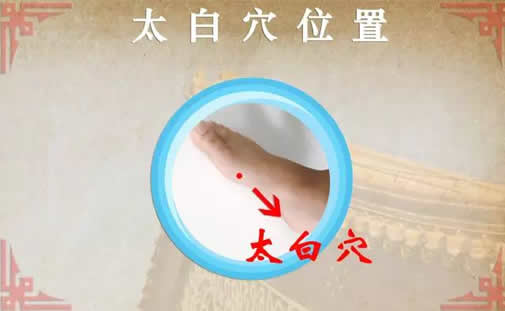 取穴法:足大趾第一跖趾关节后下方,皮肤赤白肉际凹陷处。简便取穴,则于足拇指内侧往后摸到一明显圆形骨头,骨头后赤白肉际凹陷处即是太白穴。