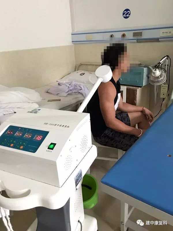 治疗方案:第一步、传统推拿手法15min;第二步、运动疗法15min;第三步、中药熏蒸治疗20min、超短波1档,45毫安,15min、脉冲磁治疗03处方,15min。
