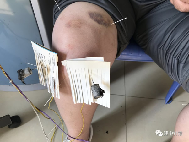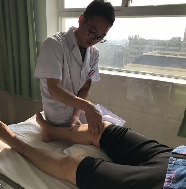 (1)取仰卧位,家人用拇指指腹端自上而下旋推其患侧膝关节周围5分钟。