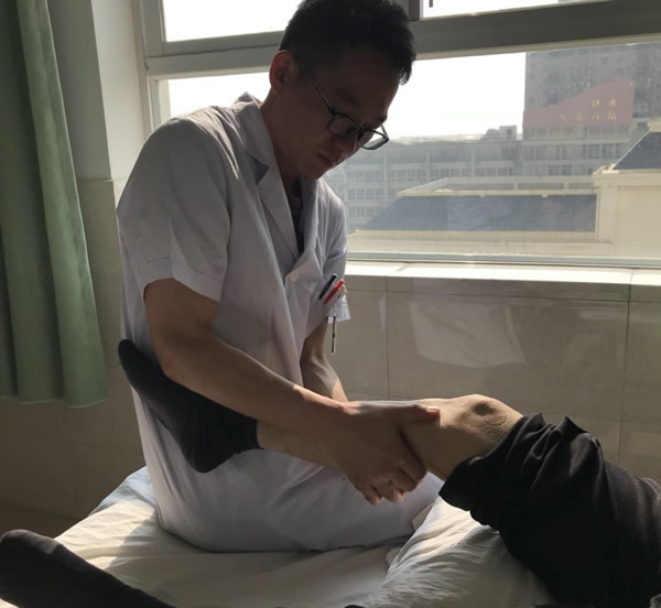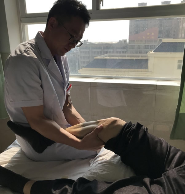 (2)取仰卧位,家人立其患侧,一手患者髌骨外侧缘,一手握患肢踝部,屈伸膝关节十数次,直至完全屈曲膝。