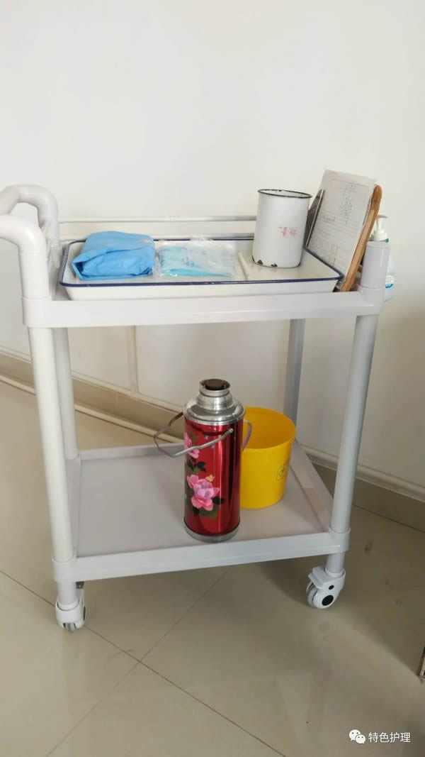 •治疗盘、药液、敷料、水温计、镊子2把、中单、 纱布、污物缸、必要时备屏风等。