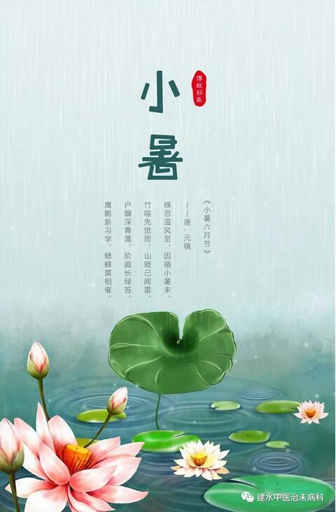 小暑是人体阳气最旺盛的时候,“春夏养阳”。所以人们在工作劳动之时,要注意劳逸结合,保护人体的阳气。小暑虽不是一年中最炎热的季节,但紧接着就是一年中最热的季节大暑,民间有“小暑大暑,上蒸下煮”之说。小暑正是民间繁忙的时候,种植蔬菜,备足过冬;此时我国大部分地区也都在忙于夏秋作物的田间管理。炎热的气候,由于出汗多,消耗大,再加之劳累,人们更不能忽略对身体的养护。