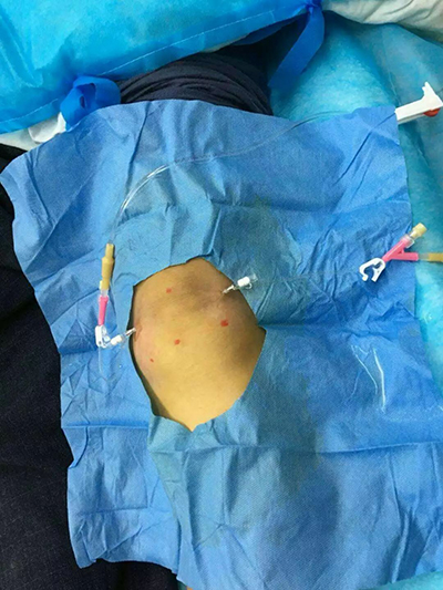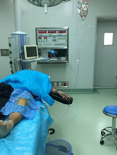 而以上治疗,我科均可实施,且疗效可观。此处主要叙述针刀配合膝关节冲洗治疗。近日,我科一名住院病人因膝关节积液并膝滑膜炎入住我科,经我科付贤用科主任、胡杨医师合作下,开展针刀配合膝关节冲洗治疗,经治疗后当天患者疼痛明显减轻。治疗第二天,患者膝关节疼痛、活动受限明显好转,治疗取得很好的疗效!