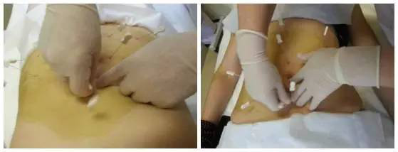 1、腹部:以脐为中心,在腹直肌、腹外斜肌,相当于任脉、足阳明胃经、足太阴脾经及足少阳胆经经穴上触按紧张的肌结(激痛点),每次选点10-20个。