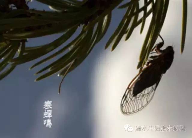 “二侯白露降”,由于白天日照仍很强烈,夜晚的凉风刮来形成一定的昼夜温差,空气中的水蒸气清晨室外植物上凝结成了一颗颗晶莹的露珠。气勃勃地 “三侯寒蝉鸣”,这时候的蝉,食物充足,温度适宜,在微风吹动的树枝上得意地鸣叫着,好像告诉人们炎热的夏天过去了。