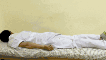 a.俯卧平躺,双臂放在身体两侧。头转向一侧。