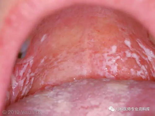 首先,舌苔比较均匀,不像鹅口疮,这一片,那一片;