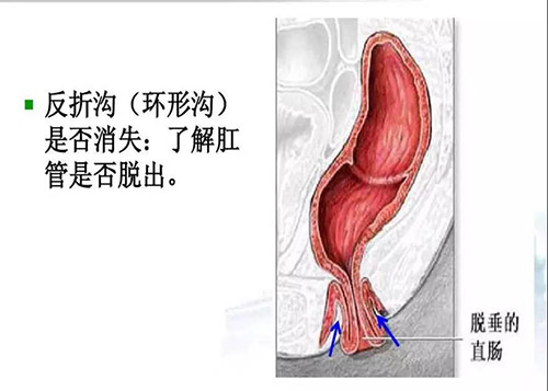 专科情况:膀胱截石位:视诊:肛门居中,增加腹压时直肠全层脱出肛门外,呈圆锥状,肛管位置正常,脱出长度约5cm,脱出直肠粘膜无溃疡、糜烂,脱出肿物表面可见螺旋状皱折;肛周皮肤无溃破、流脓。指检:肛缘无触痛;脱出直肠用手可按回,直肠中下段未触及硬性包块,指套无染血,肛门扩约肌松弛。镜检:肛管粘膜未见糜烂渗血。外生殖器未见异常。