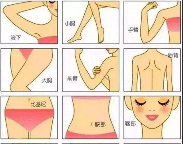 唇毛、络腮胡、发际线、腋毛、胸毛、前臂、上臂、小腿、大腿、比基尼等部位均适合光子脱毛。
